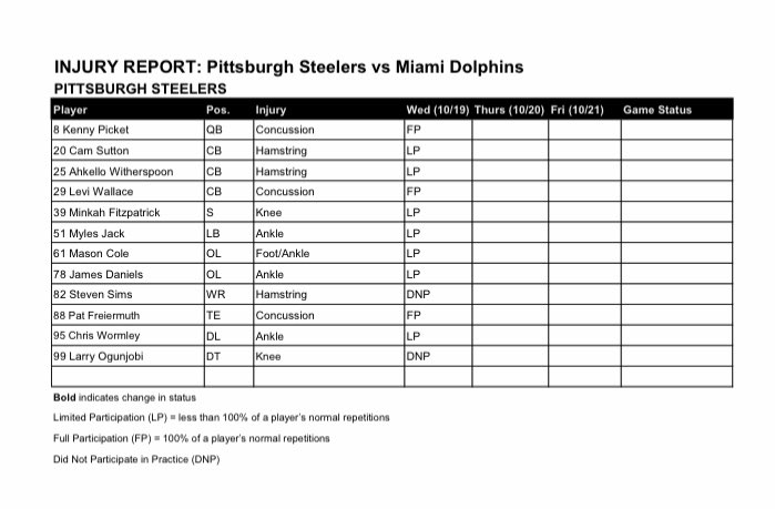 The practice report from Wednesday was as dizzying as it was last week but there is hope. A lot more hope than there was last week at this time I know that much. Kenny Pickett remains in concussion protocol but was a full participant yesterday. That’s no guarantee of his availability for Sunday night but it’s trending in the right direction. Larry Ogunjobi, who was such a force on Sunday, did not practice yesterday due to a bum knee. I’m not ready to count him out yet. Both Levi Wallace and Pat Freiermuth were full participants yesterday as well after missing last week due to concussions. Ironically, the Steelers will likely see the guy (Tua Tagovailoa) whose head trauma started a renewed focus of head injury treatment. He revealed this week that he didn’t remember anything from the Bengals’ game. That’s pretty alarming if you ask me but it is what it is. I think he plays Sunday night. The Steelers survived last week with a patchwork secondary and now have to face significantly more speed in Tyreek Hill and company. Having some starters back in there would be most ideal. The NFL after all is a week to week venture, meaning that what happens one week has ZERO to do with what happens the following week.